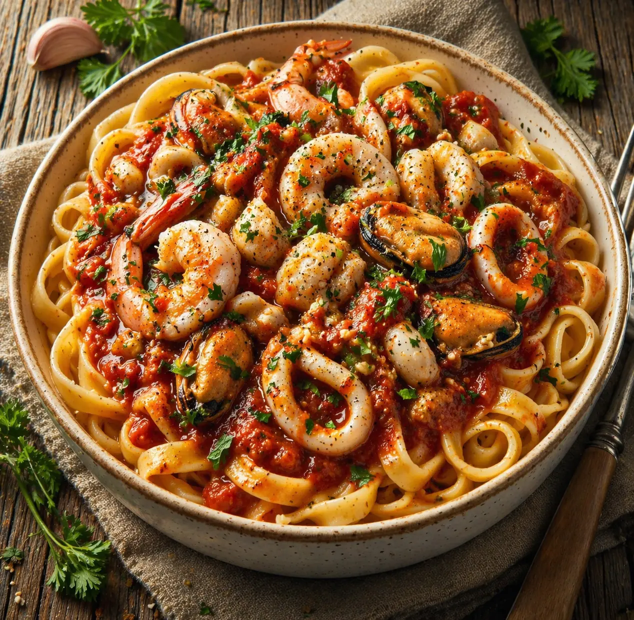 Sauce tomate, cocktail de fruits de mer, ail , persil