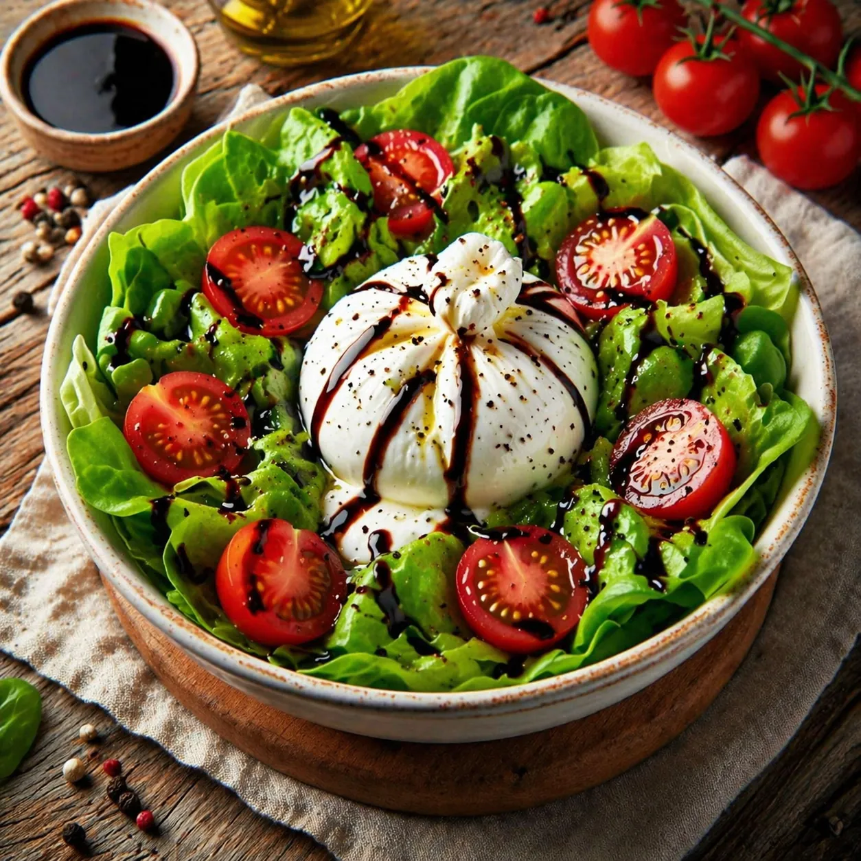 Salade verte, tomates, burata, crème balsamique